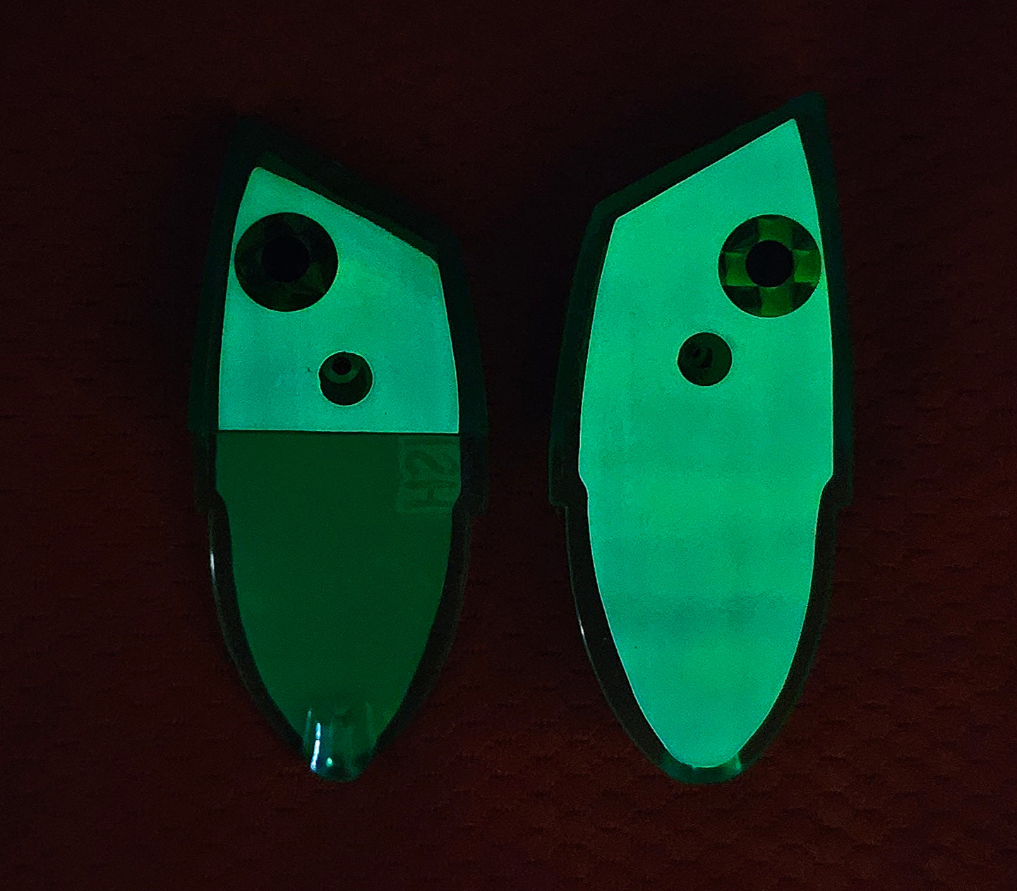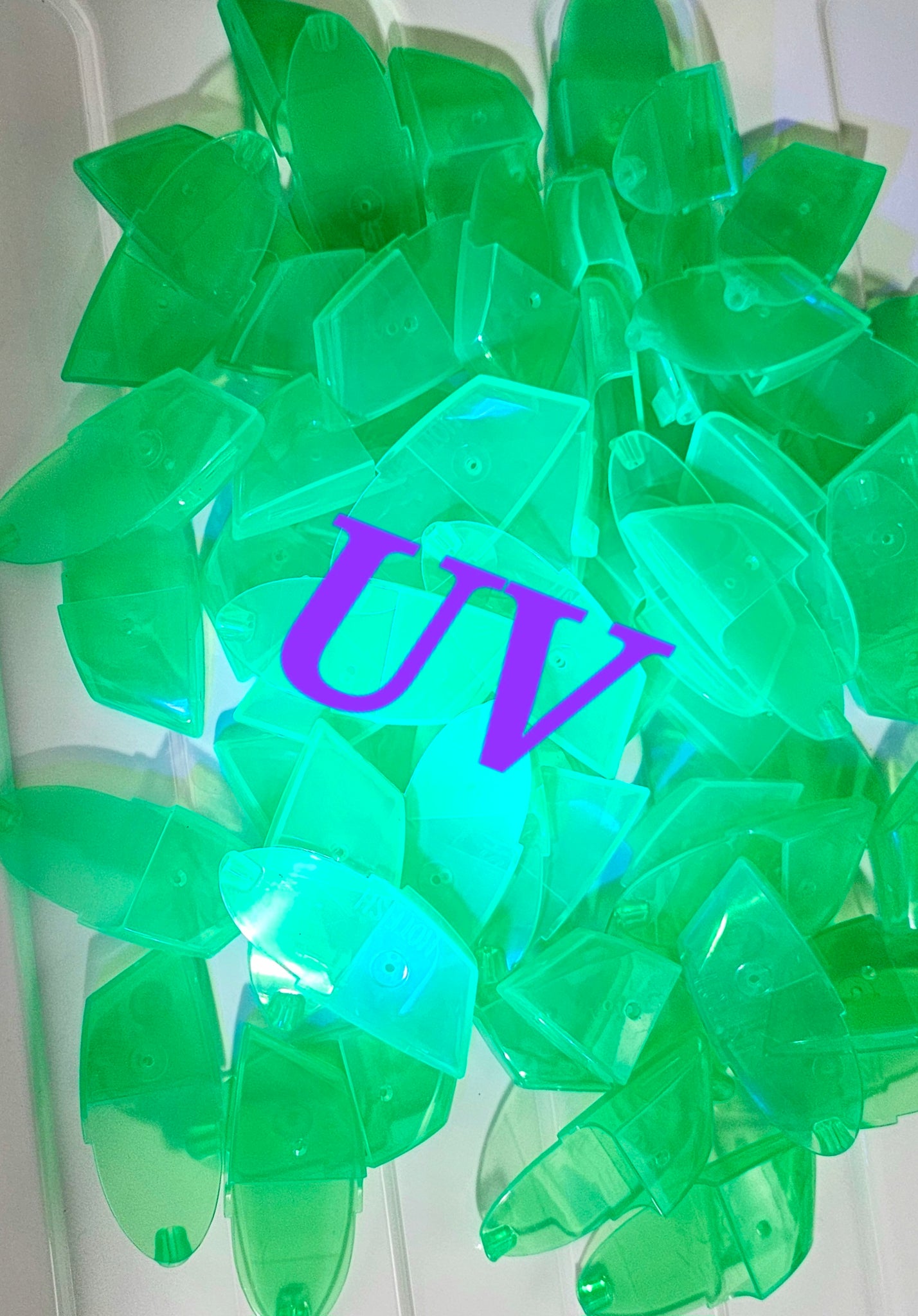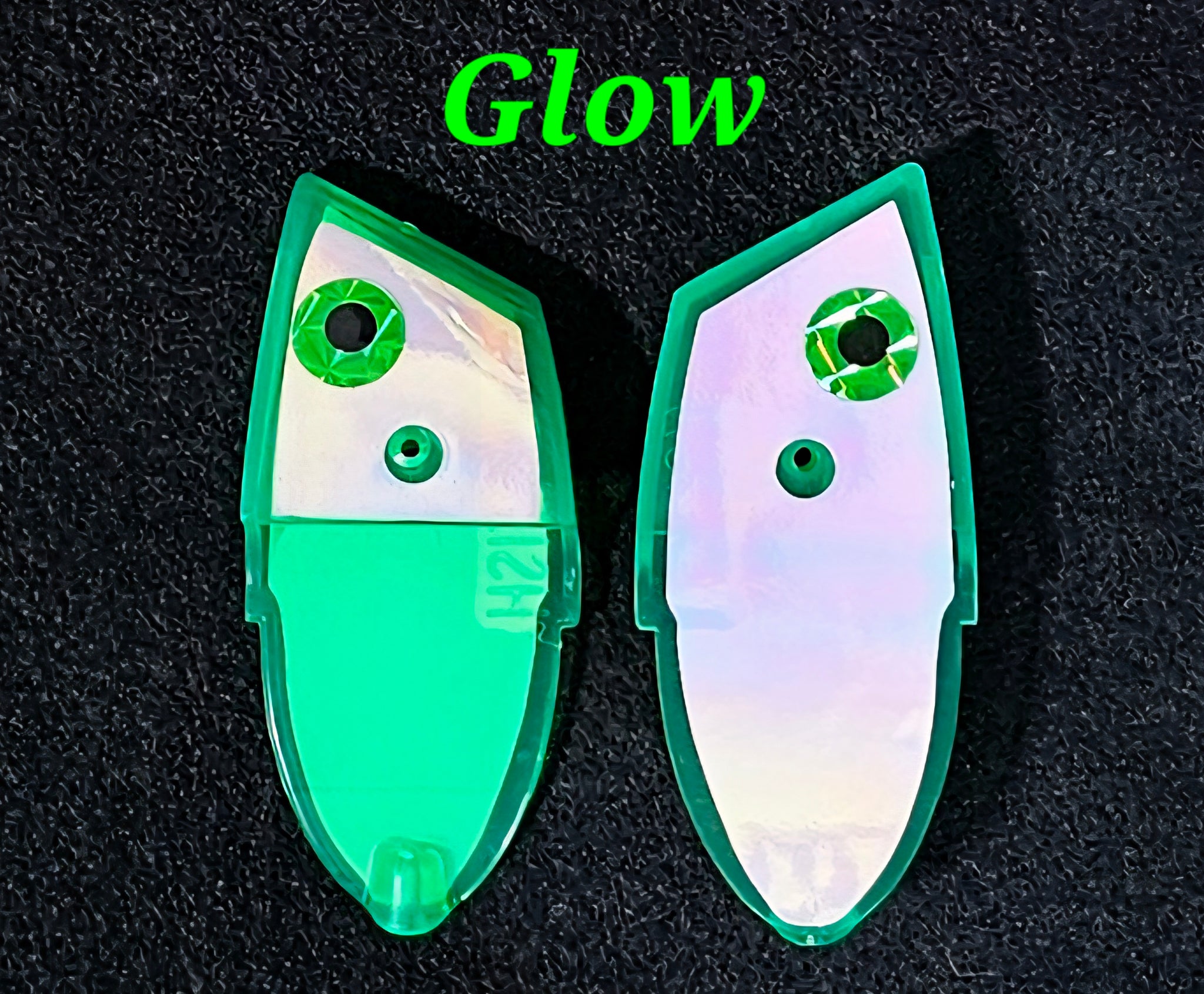 Bait Head Dark Green with Ultraviolet blended in. Glow smooth pearl tape both sides